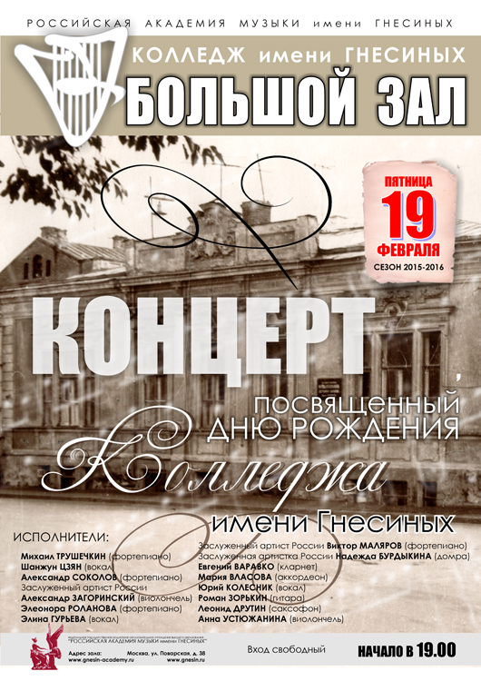 | 23 марта 2016 18 февраля в Малом зале Колледжа имени Гнесиных состоялся вечер памяти Заслуженной артистки СССР Ирины Константиновны Архиповой. В концерте приняли участие студенты и педагоги Колледжа, коллеги и близкие друзья выдающейся певицы. 23 марта 2016 Поздравляем студентов и преподавателей с победами на конкурсах в феврале 2016 года! 22 марта 2016