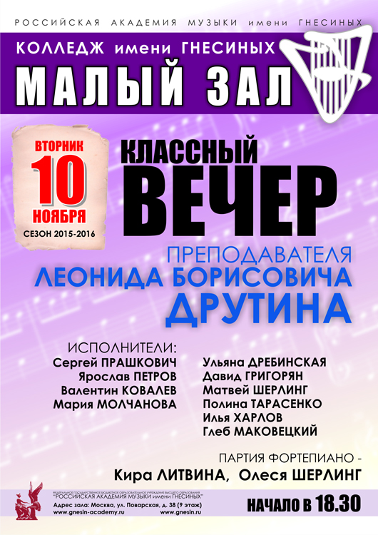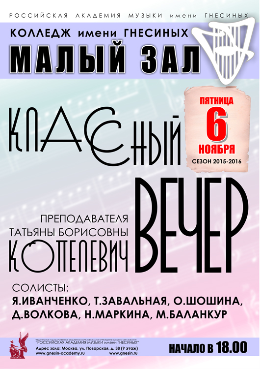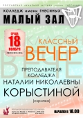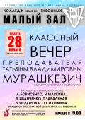 суббота |  | Классный вечер преподавателя Мурашкевич Т.В. (концертмейстерский класс)