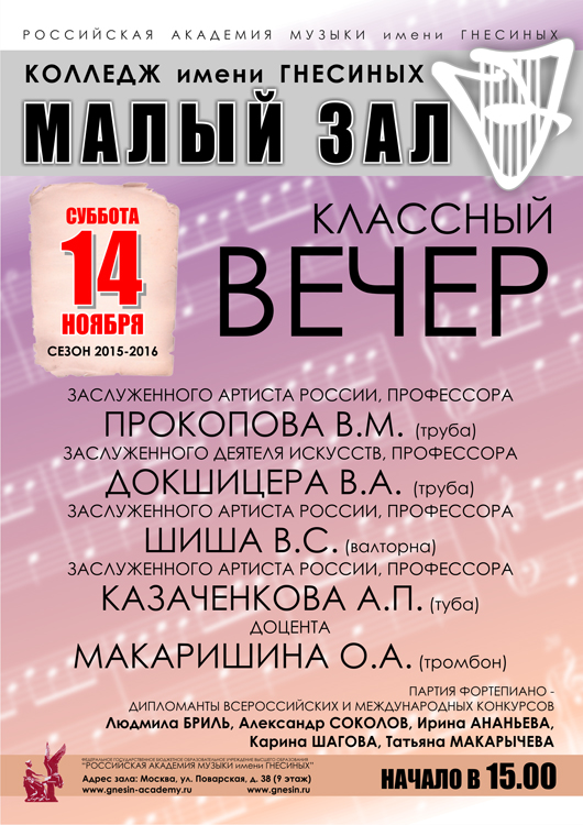 суббота |  | Классный вечер преподавателей Шиша В.С., Докшицера В.А., Макаришина О.А., Казаченкова А.П. (медные духовые инструменты)