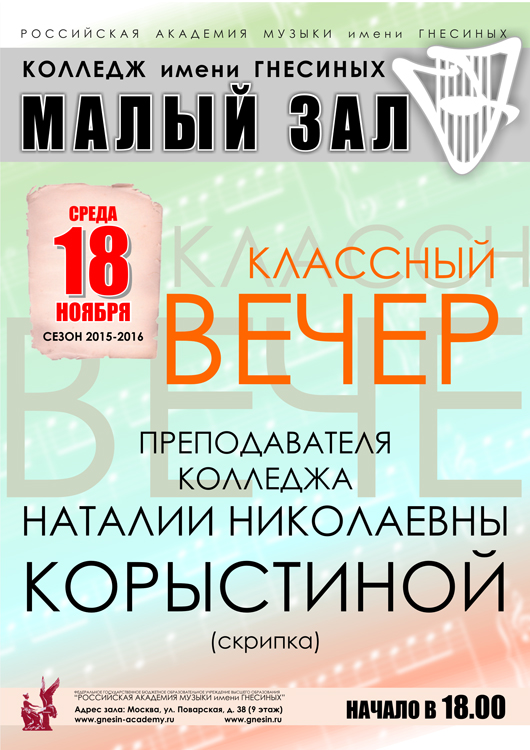 среда |  | Классный вечер преподавателя Корыстиной Н.Н. (скрипка)