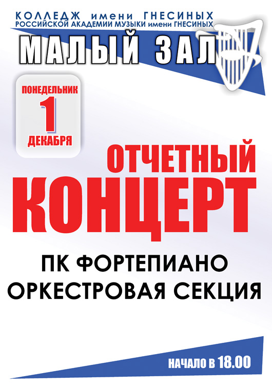 понедельник |  | Отчетный концерт ПК «Фортепиано для разных специальностей» - оркестровая секция