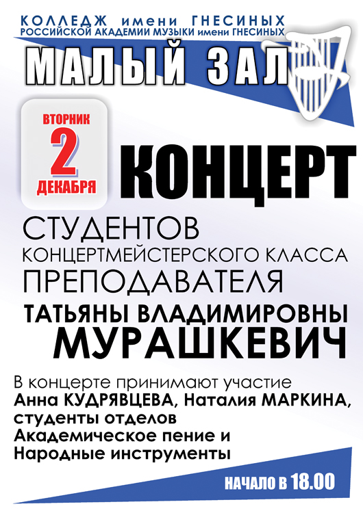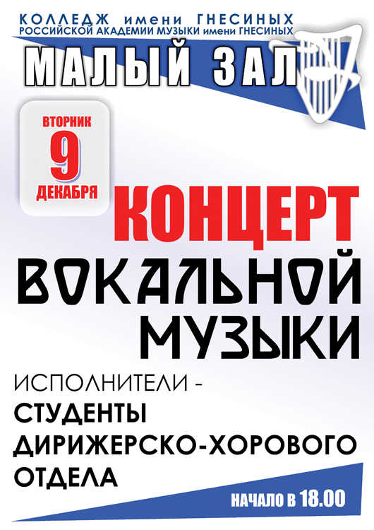 вторник |  | Концерт студентов отдела «Хоровое дирижирование» по предмету «Постановка голоса»