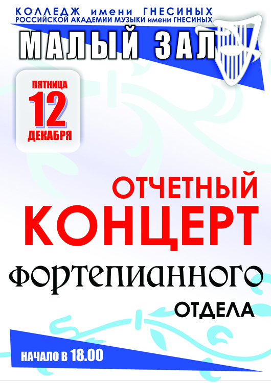 пятница |  | Отчетный концерт фортепианного отделения Детской музыкальной школы РАМ им. Гнесиных