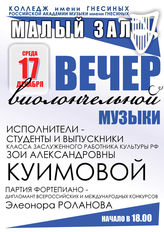 среда |  | Классный вечер преподавателя З.А.Куимовой (виолончель)