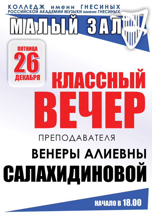 понедельник |  | Классный вечер преподавателя Друтина Л.Б. (саксофон)