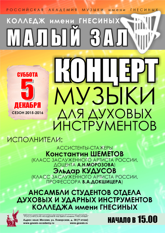 суббота |  | Концерт аспирантов заслуженного работника культуры РФ В.А.Докшицера и духовых ансамблей Колледжа