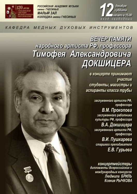 суббота |  | «Вечер памяти народного артиста РФ, профессора Т.А. Докшицера (кафедра медных духовых инструментов)»