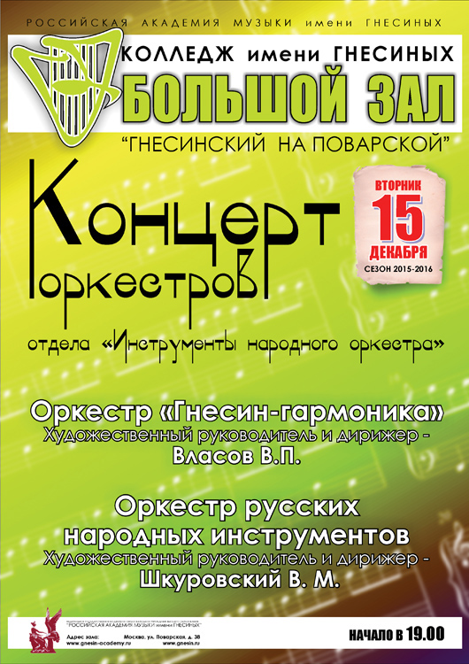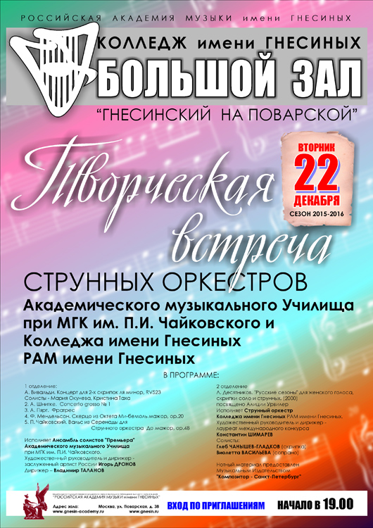 вторник |  | Концерт Струнных оркестров Колледжа имени Гнесиных РАМ им. Гнесиных и Академического музыкального училища при МГК им. П.И.Чайковского