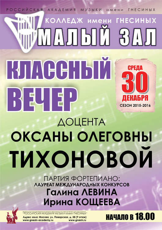 среда |  | Классный вечер доцента Тихоновой О.О. (скрипка)