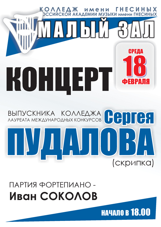 среда |  | Концерт выпускника Колледжа Сергея Пудалова (скрипка)