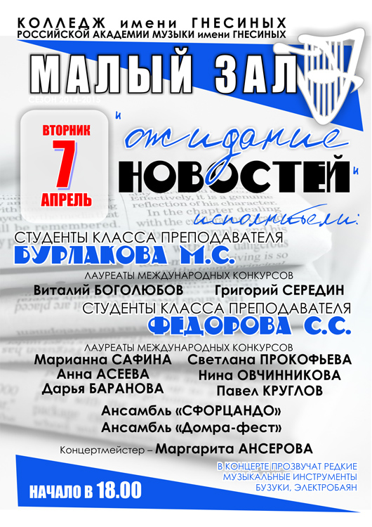 понедельник | Академический вечер студентов специальности «Народные инструменты» (гитара, гусли) |