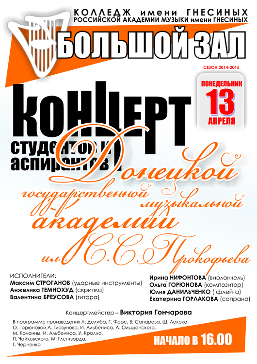 понедельник |  | Концерт студентов и аспирантов Донецкой государственной музыкальной академии им. С.С. Прокофьева