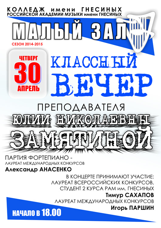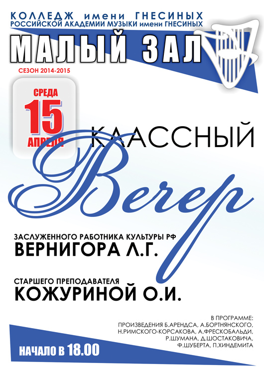 среда |  | Классный вечер преподавателей Л.Г.Вернигора и Кожуриной О.И. (альт)