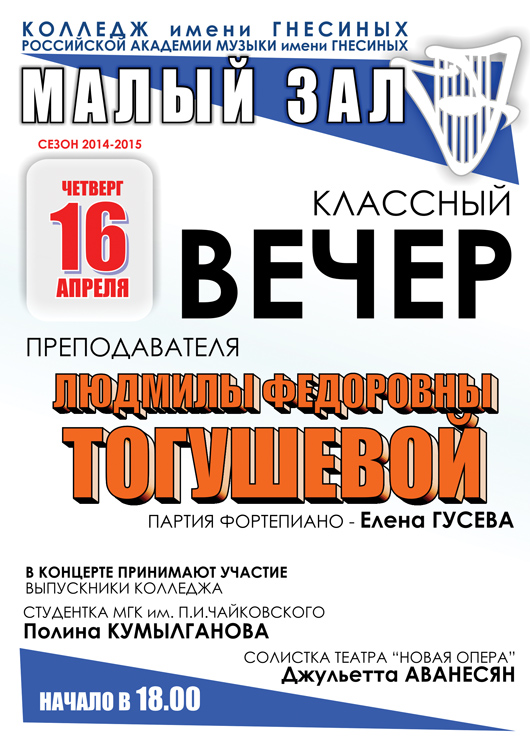 четверг | Классный вечер преподавателя Л.Ф.Тогушевой (вокал)