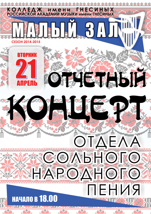 вторник |  | Отчетный концерт отдела «Сольное народное пение»
