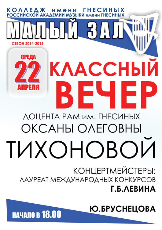 среда |  | Классный вечер преподавателя О.О.Тихоновой (альт)