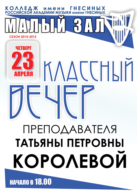 четверг |  | Классный вечер преподавателя Т.П.Королёвой (фортепиано)
