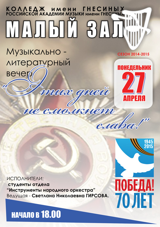 понедельник |  | Музыкально-литературный вечер, посвященный 70-летию Победы «Этих дней не смолкнет слава!»