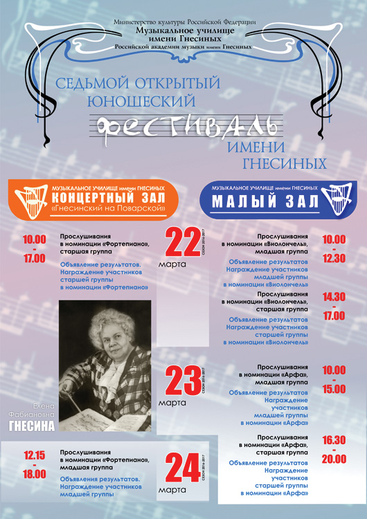 Желающие также могли смотреть online трансляцию концерта на канале Собора в Youtube. 10 апреля 2017 С 22 по 24 марта в Музыкальном училище имени Гнесиных проходил VII Открытый юношеский фестиваль имени Гнесиных. Фестиваль проводился в трех номинациях: «Фортепиано», «Виолончель» и «Арфа». В фестивале приняли участие ученики музыкальных школ со всей страны в возрасте от девяти до шестнадцати лет. 06 апреля 2017