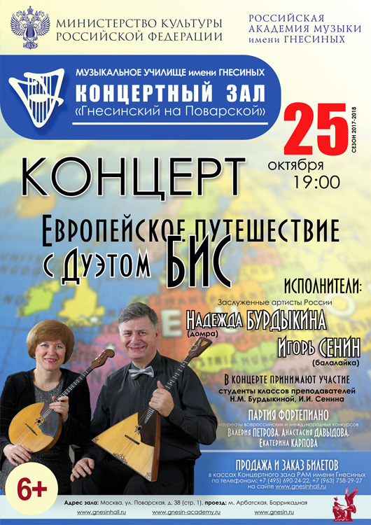25 октября 2017 года в Большом зале Музыкального училища имени Гнесиных состоялся концерт «Европейское путешествие с дуэтом БИС». Этот концерт является вторым событием проекта «Играют преподаватели Музыкального училища имени Гнесиных».