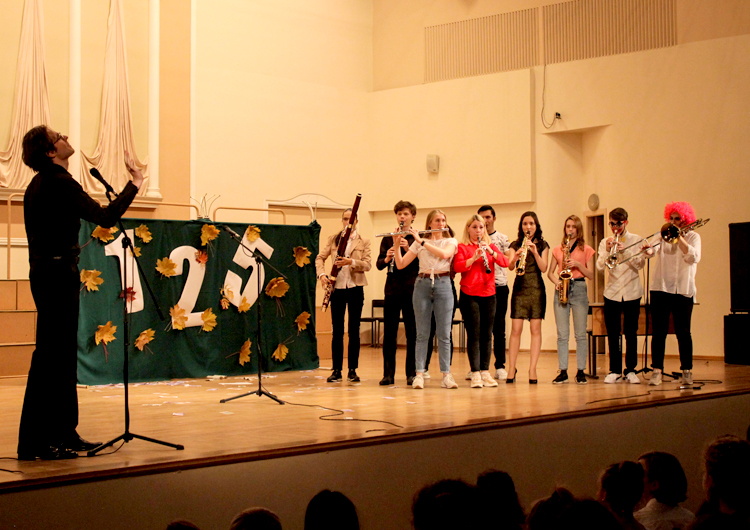 «Нам 125!» Под этим лозунгом 18 октября 2019 года в Большом зале Музыкального училища имени Гнесиных состоялось «Посвящение в студенты» - праздник, который училище ежегодно отмечает через полтора месяца после начала учебы. «Новобранцы» - первый курс - к этому времени уже успели познать некоторые прелести студенчества, а о других «подводных камнях» им рассказали студенты старших курсов в своих юмористических капустниках.