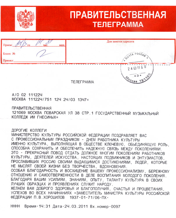 От участников мероприятия и их преподавателей в адрес фестиваля было высказано много теплых слов за предоставленную возможность публично реализовать творческие планы и замыслы. Очень надеемся, что подобный вид творческого общения будет продолжаться и станет традицией. А. Черных 03 апреля 2011 Поздравляем преподавателя отдела «Теория музыки» Меликсетян Софью Владимировну с успешной защитой в Московской государственной консерватории имени П.И. Чайковского кандидатской диссертации на тему «Русский музыкальный конструктивизм» (научный руководитель — профессор, доктор искусствоведения Степанова И.В.) 03 апреля 2011 В разделе «Вступительные испытания» вывешены образцы экзаменационных билетов по сольфеджио. 30 марта 2011 По традиции, в третью субботу марта на отделе «Народные инструменты» проходят вечера встречи выпускников. В этом году такой вечер прошел 26 марта в Малом зале Колледжа. По инициативе заведующей отделом Бурдыкиной Надежды Михайловны, в концерте приняли участие не только выпускники, но и будущие абитуриенты — учащиеся подготовительных курсов Колледжа. Е. Климова 25 марта 2011 25 марта — День работников культуры. Поздравляем всех преподавателей и сотрудников колледжа с профессиональным праздником!
