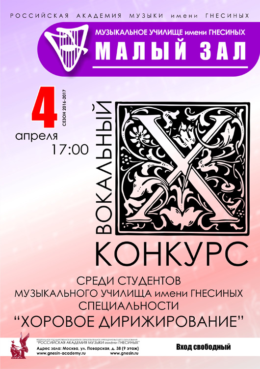4 апреля 2017 года прошел X Вокальный конкурс среди студентов отдела хорового дирижирования, который проводится ежегодно в Малом зале Музыкального училища имени Гнесиных.