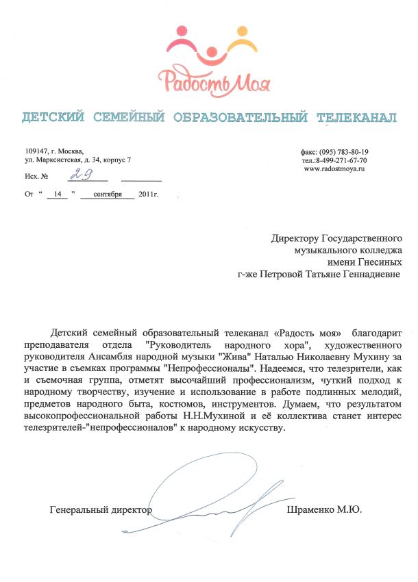 14 сентября преподаватель отдела «Руководитель народного хора» Мухина Наталия Николаевна приняла участие в съемках программы «Непрофессионалы» на Детском семейном образовательном телеканале «Радость моя».